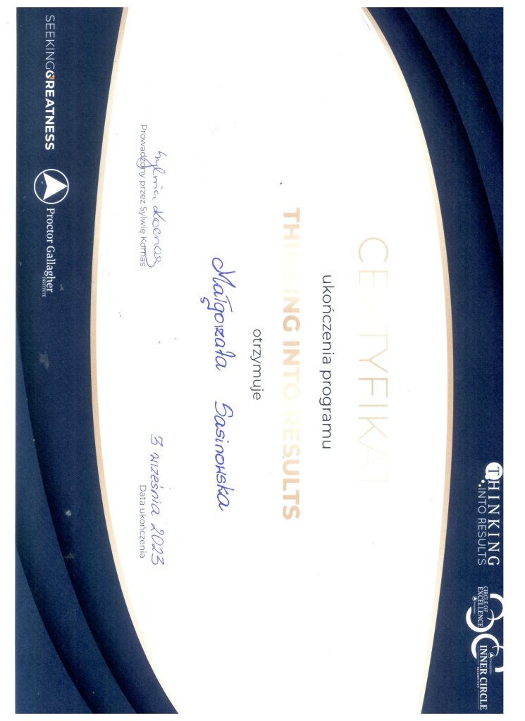 Uwierzyłam, że jestem wartościowa, mądra i godna wszelkiego dobra. Uwierzyłam, że mogę robić to, czego pragnę i mam prawo chcieć od życia więcej. Odzyskałam swoją moc i wiarę w siebie. Przestałam uzależniać moje szczęście od innych ludzi i warunków zewnętrznych. Przestałam stać sobie sama na drodze. Zamiast wymówek szukam rozwiązań. Kiedy podejmuję decyzję pojawiają się najlepsze dla mnie możliwości i rozwiązania. I chcę Ci powiedzieć, że zmiana jest możliwa w każdym momencie życia. To od nas zależy, czy podejmiemy decyzję i podążymy za głosem intuicji. Kiedyś nie mogłam ruszyć do przodu. Blokujące przekonania, przeszłość i brak wiary w siebie trzymały mnie w miejscu.